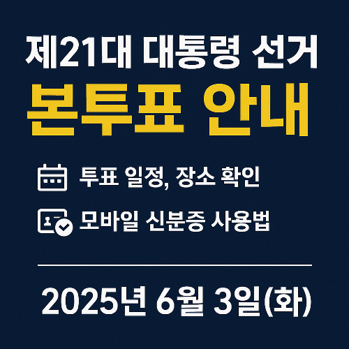 2025년 6월 3일(화)은 제21대 대통령 선거일입니다. 사전투표는 5월 30일(금) 오후 6시에 마감되었으며, 본투표에 참여하실 유권자분들을 위해 투표 일정, 장소 확인 방법, 모바일 신분증 사용법 등을 정리해 드리겠습니다.